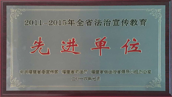 10月12日,在福建省國資委全系統“六五”普法總結表彰暨“七五”普法動員部署大會上,公司榮獲“2011-2015年全省法治宣傳教育先進單位”榮譽稱號,此項評選活動由福建省委宣傳部、省司法廳、省依法治省辦組織。